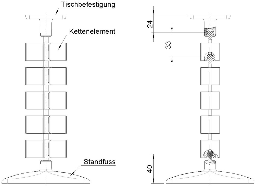 | Bestellnummer | Farbe | Länge Element | Befestigung und Fuß | nutzbare Länge | Anzahl Kettenelemente | Preis * |