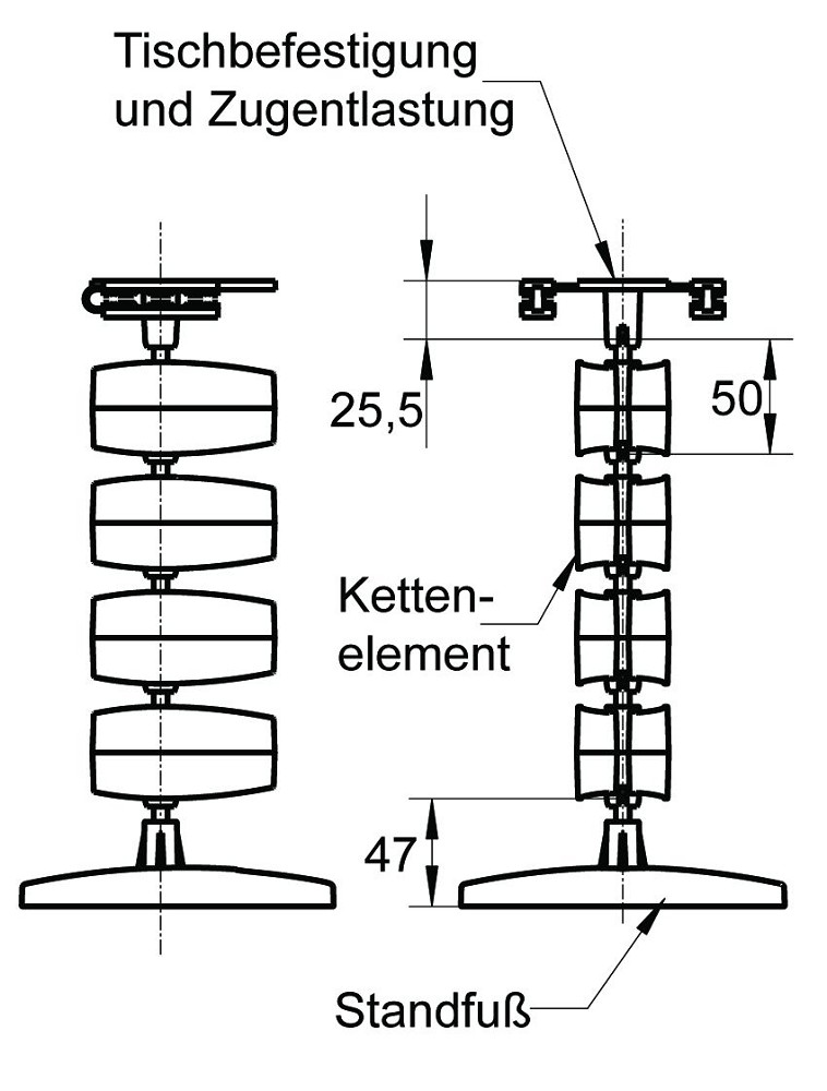 | Bestellnummer | Farbe | Länge Element | nutzbare Gesamtlänge | Befestigung und Fuß | Anzahl Kettenelemente | Preis * |